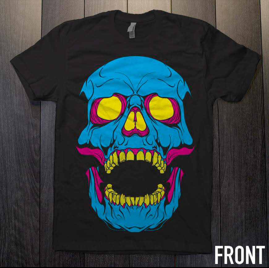 This oversized image with definitely get you noticed, inspired by a childhood spent at the arcade, this screaming skull is CMYK glory!